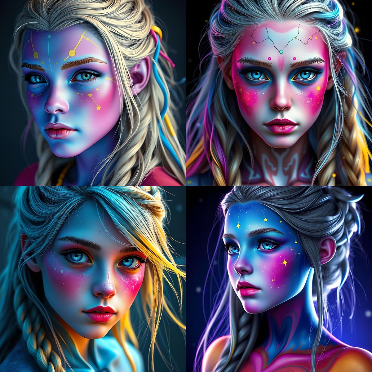 A striking picture of a beautiful alien woman with ombré skin and bright eyes. Constellation markings cover her body, and her flaxen hair features blue and yellow highlights, in a dynamic and detailed digital painting style.