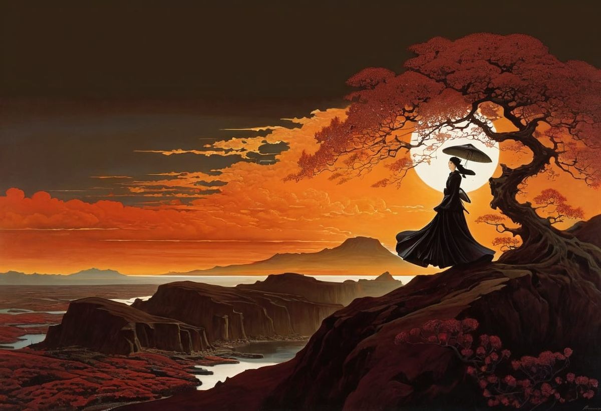 This image brings together the organic lines of Aubrey Vincent Beardsley and the rich colors of Gustav Klimt, set against a futuristic backdrop reminiscent of Takato Yamamoto's works.