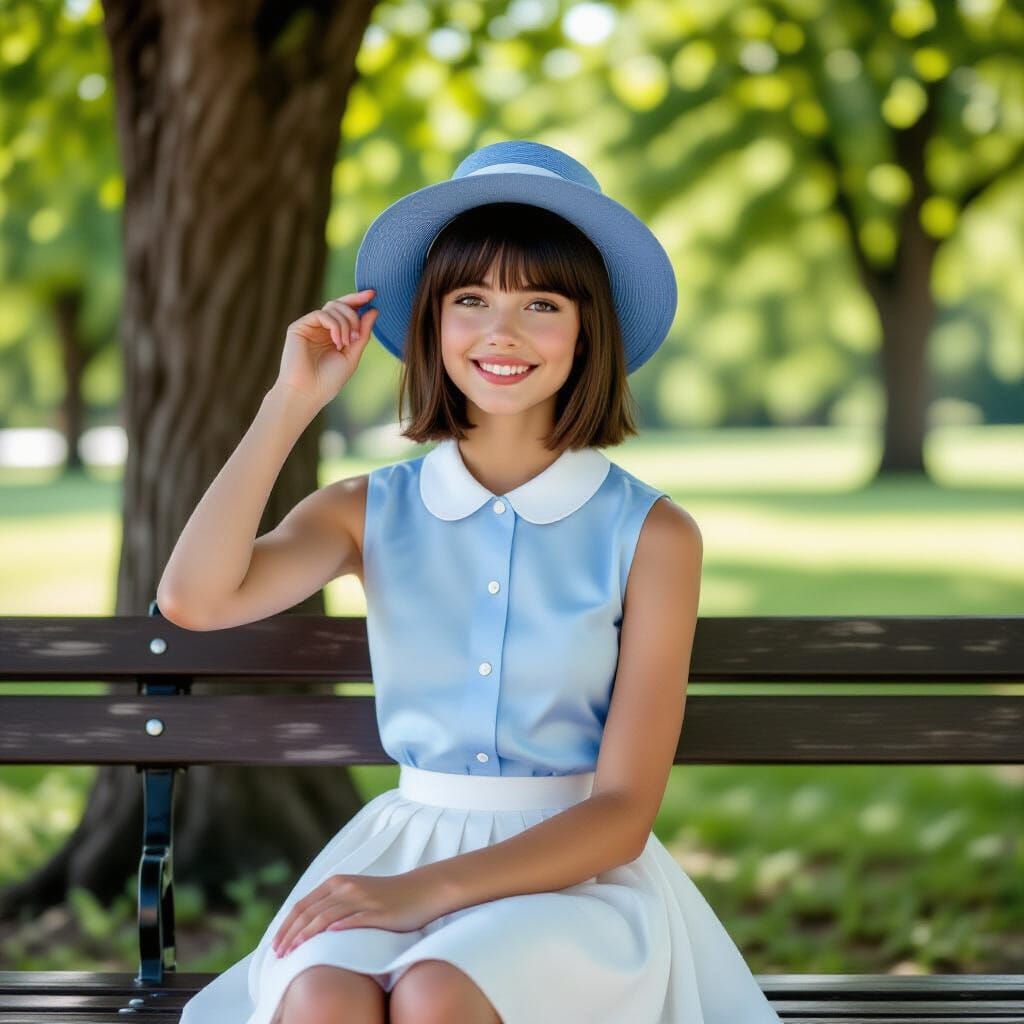 This image shows a 14-year-old girl sitting on a park bench. She has fair skin, dark hair, and wears a blue top and white skirt. The high-angle photo has a soft, dreamy aesthetic.