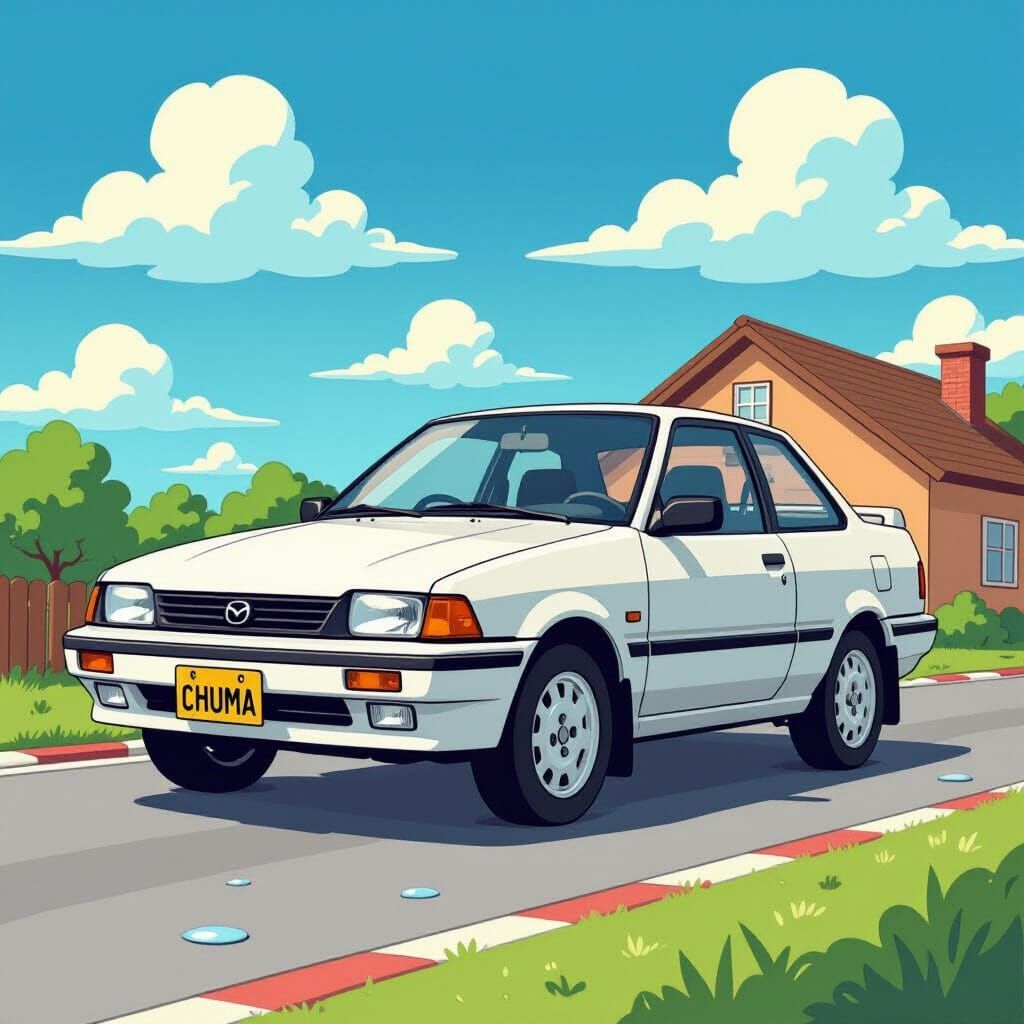 This image shows a white 1990s Mazda 323 with a personalized number plate, rendered in a whimsical cartoon style. The composition features bold lighting and vibrant textures.