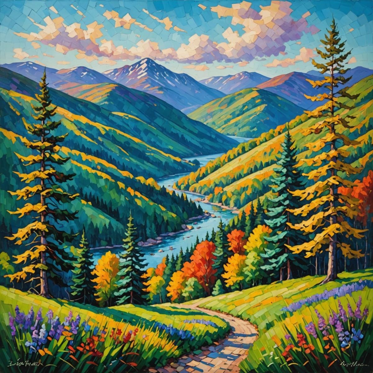 A vibrant image of a New England mountain landscape. Thick layers of colorful textured paint create an impasto effect in the style of post-impressionist acrylic painting.