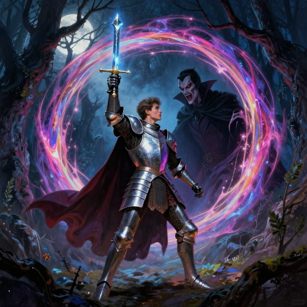 This image depicts a heroic gay warrior in armor, holding Excalibur, confronting a vampire near a magical portal in a dark forest. Rendered in a dramatic, painterly fantasy style with vivid colors and dynamic lighting.