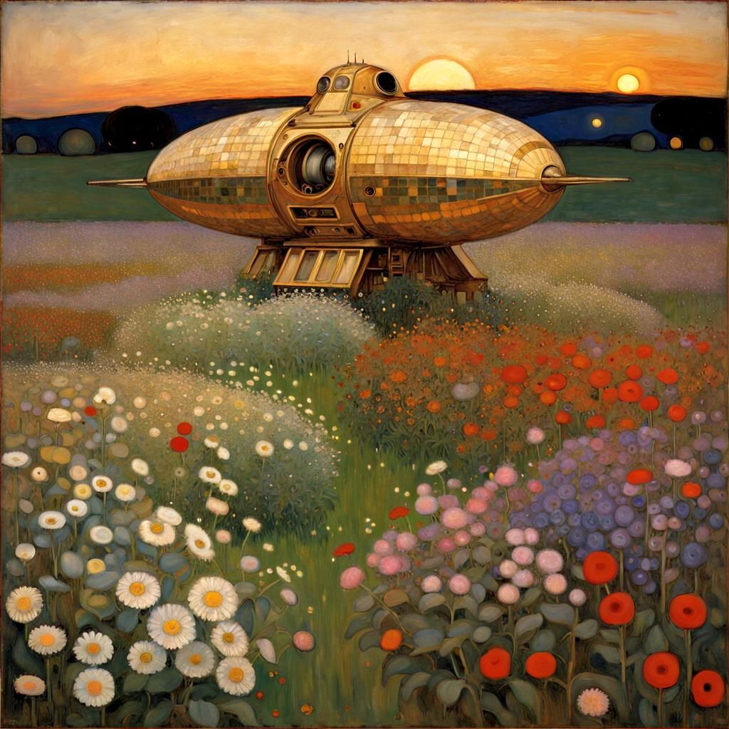 A vibrant artwork of a spaceship nestled in a flower field at sunset. The image is rendered in the style of early 20th century Jugendstil paintings, full of pattern and bright color.