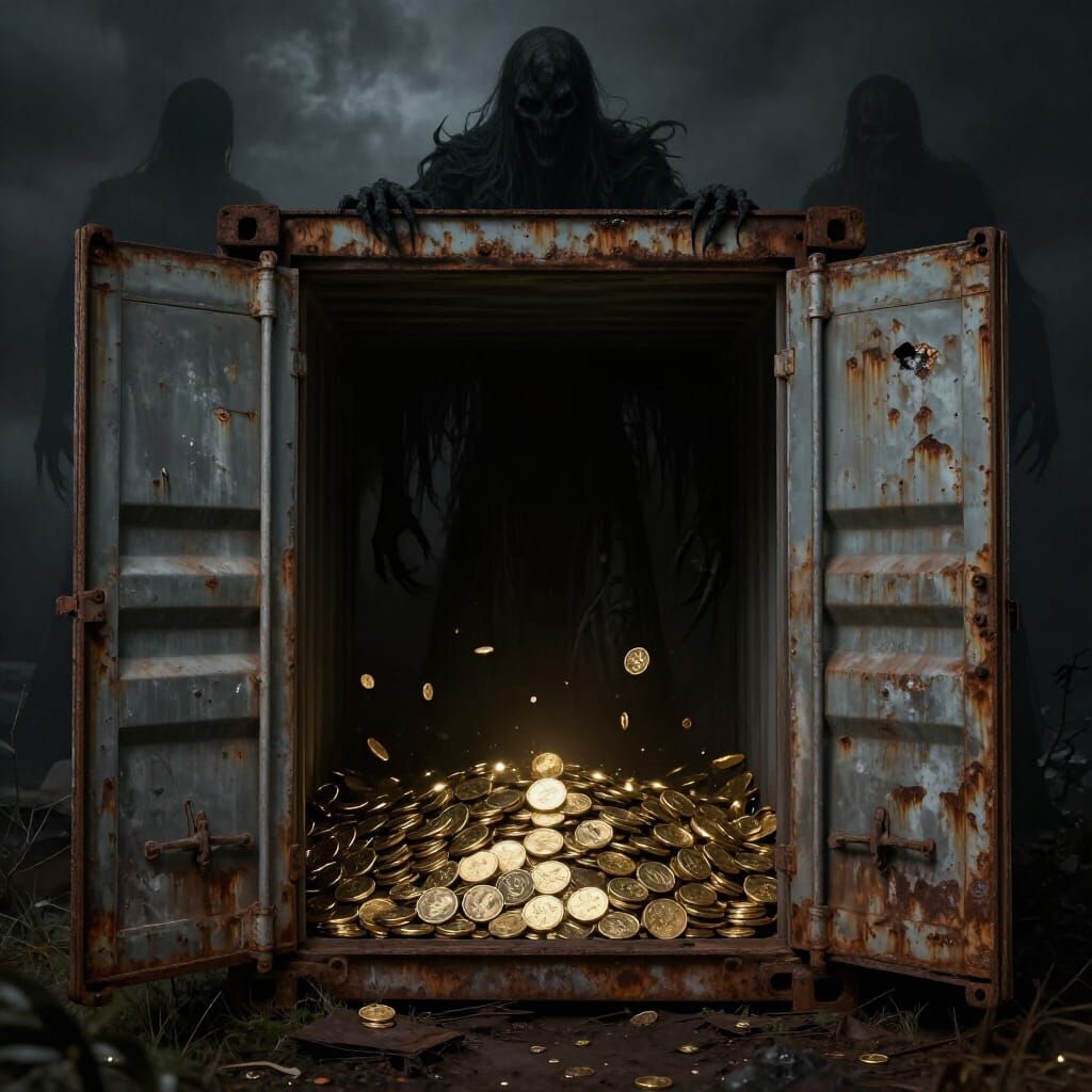This image depicts a derelict shipping container filled with cursed gold coins, guarded by menacing shadow figures. Rendered in a dark fantasy concept art style with dramatic lighting.