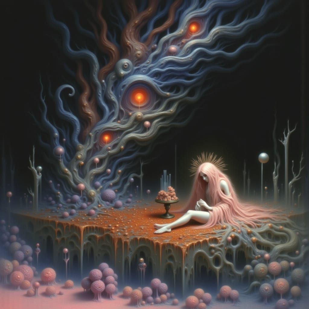 This image depicts a hyperdetailed, ornate surrealist dreamscape. A glowing fairy is central to the scene, set against a pastel color palette with soft macabre undertones and maximalist elements.