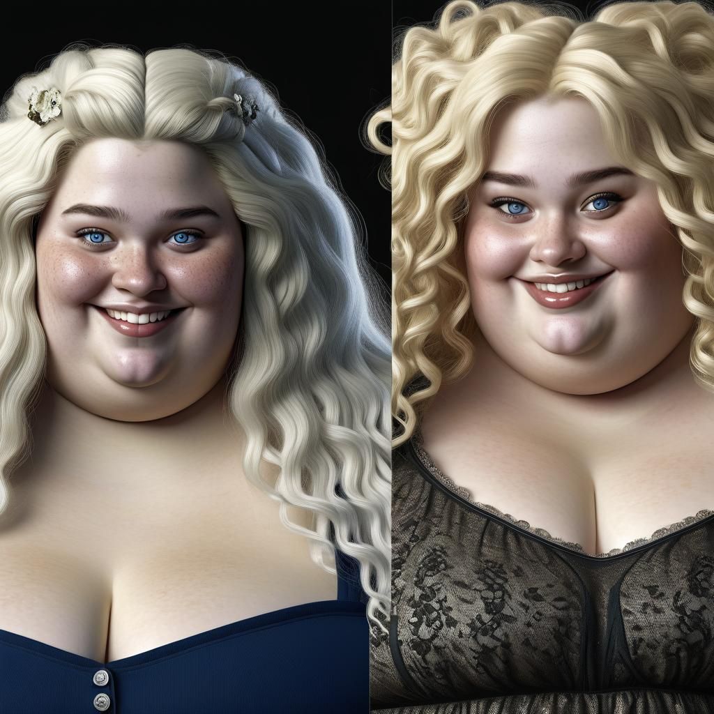 This image shows a digital painting of two extremely obese young women, one Black and one white, smiling. The artwork features a fantasy concept art style with deep colors and intricate details.