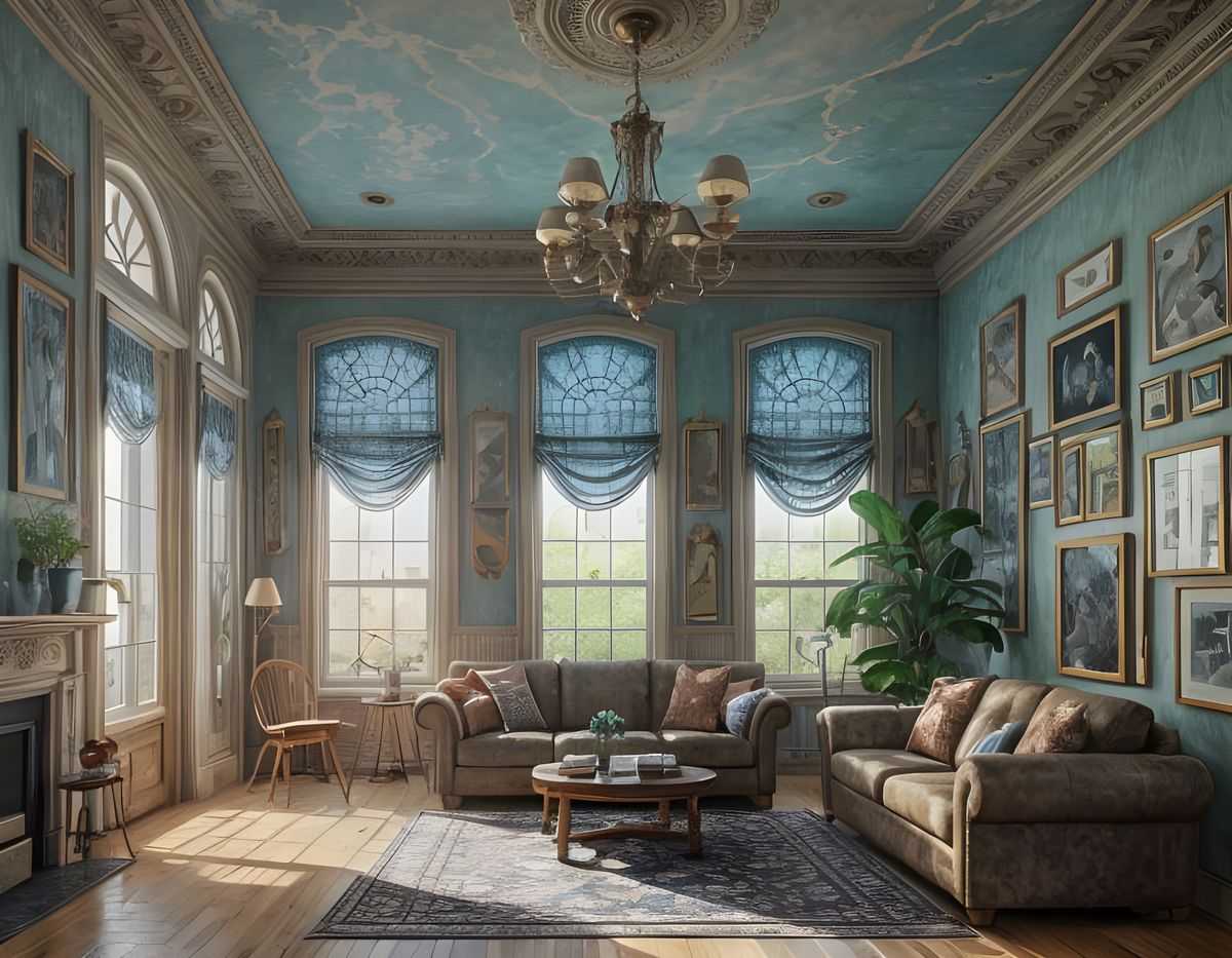 This image showcases a vibrant, colorful living room in a Kidcore aesthetic. The watercolor rendering and HDR create a detailed, fantastical, and intricately designed scene.