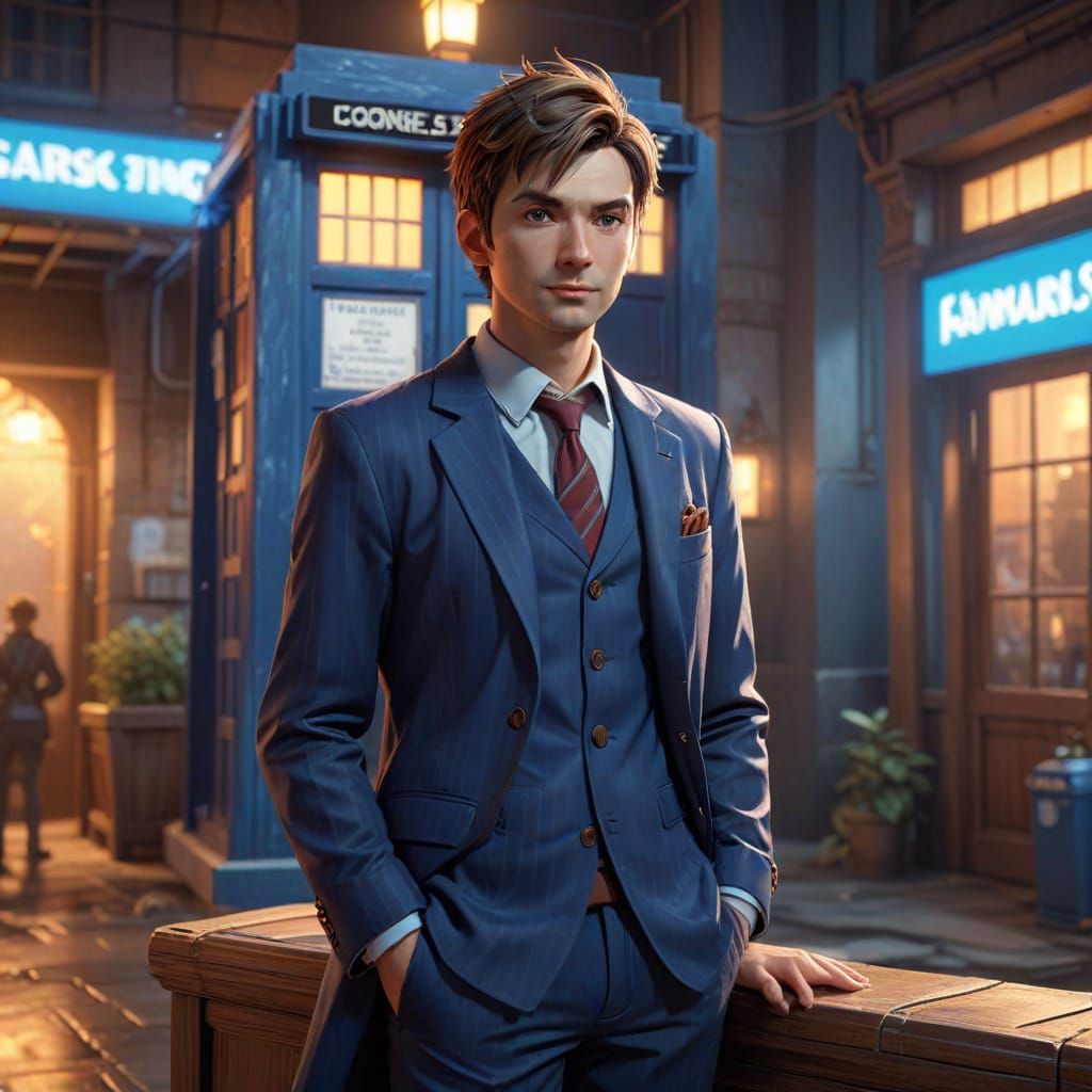 This image shows a 3D anime-style medium shot of the 10th Doctor, leaning on the Tardis. The portrait, inspired by WLOP, features vibrant colors and dynamic lighting in a Genshin Impact aesthetic.