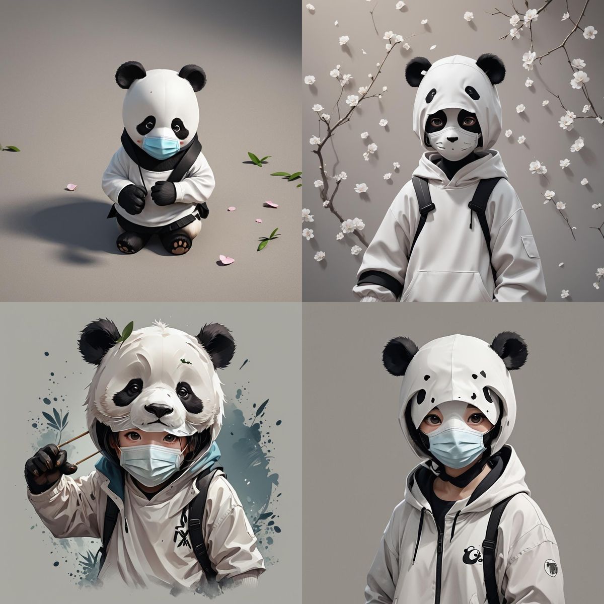 This image shows an adorable panda wearing a face mask. The artwork, rendered in 3D, showcases a detailed anime aesthetic with a breathtaking level of detail.