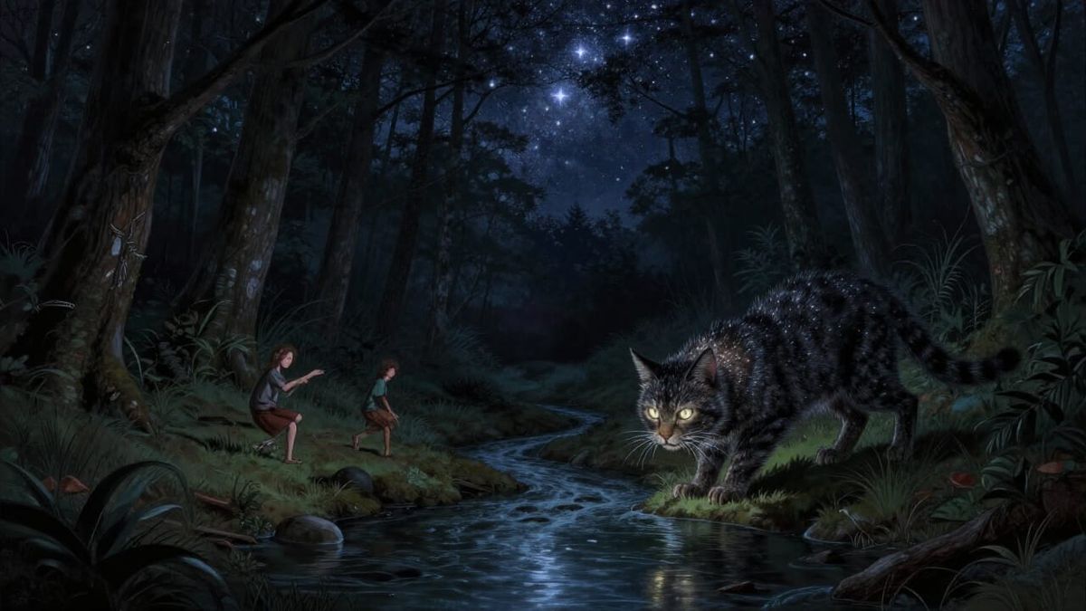 A mystical forest scene at night with woodland fae playing by a star-filled stream. A giant, luminous-eyed cat approaches, rendered with dramatic lighting and an ethereal atmosphere.
