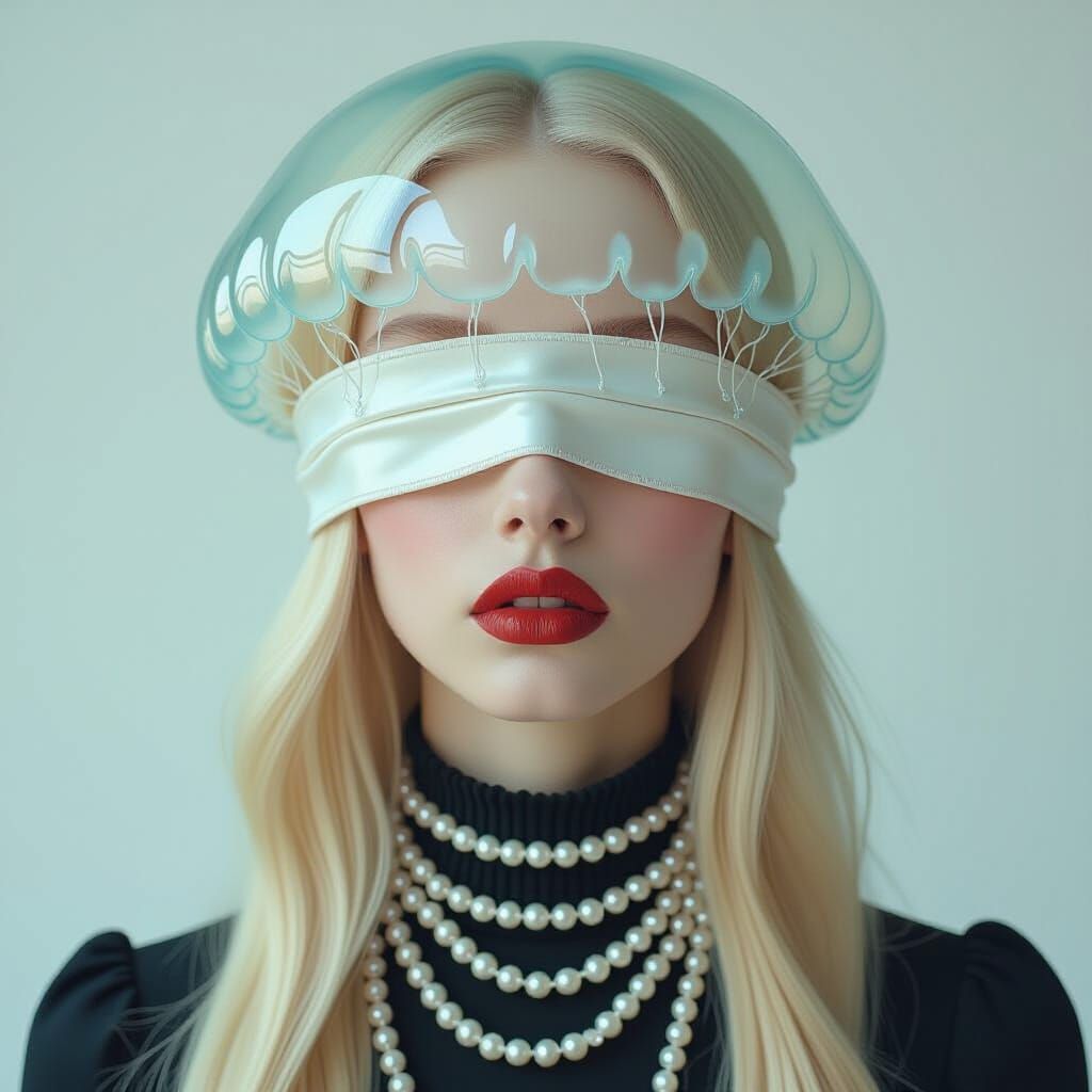 A surreal image of a blonde woman in a stark setting. The woman's eyes are covered by a jellyfish, and pearls cover her mouth, in soft pastel colors with delicate brushwork.