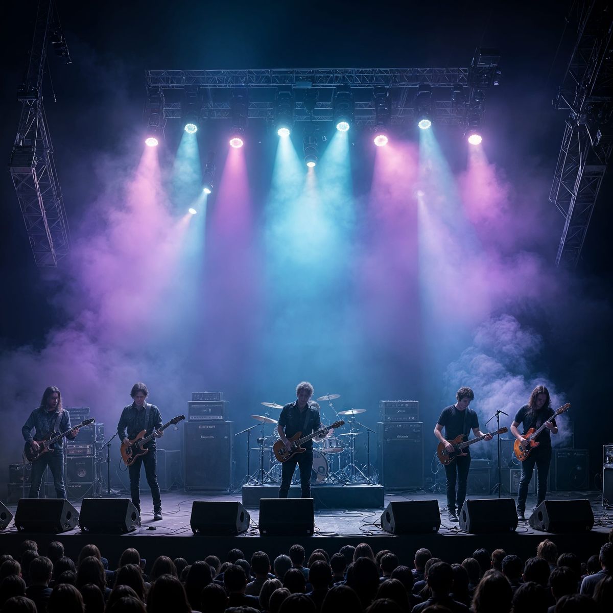 This image shows a rock concert stage set for a five-piece band. Swirling smoke and dramatic purple and aqua lighting create an atmospheric, moody scene. The image is hyperrealistic with sharp focus.