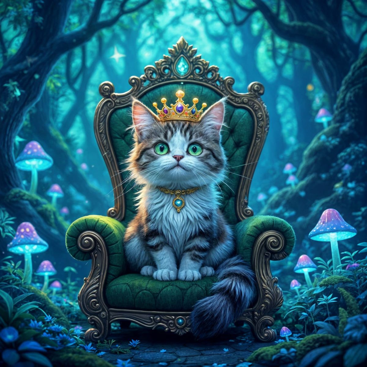 A charming digital illustration of an anthropomorphic cat with a crown, seated on a throne in a magical, glowing forest. Features bright, saturated colors in a delightful storybook style.