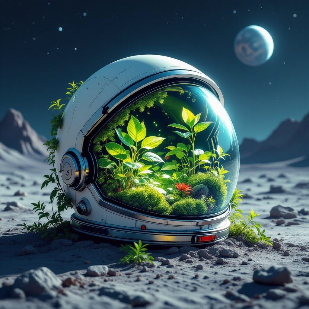 This image shows a miniature garden ecosystem inside an astronaut helmet on an alien planet. The plants glow with bioluminescence, rendered with hyperrealistic detail in a concept art style.