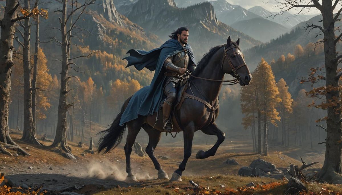 This image depicts a man in medieval attire riding a horse through a pre-winter forest. The artwork is a detailed matte painting with dynamic lighting, reminiscent of dark fantasy concept art.