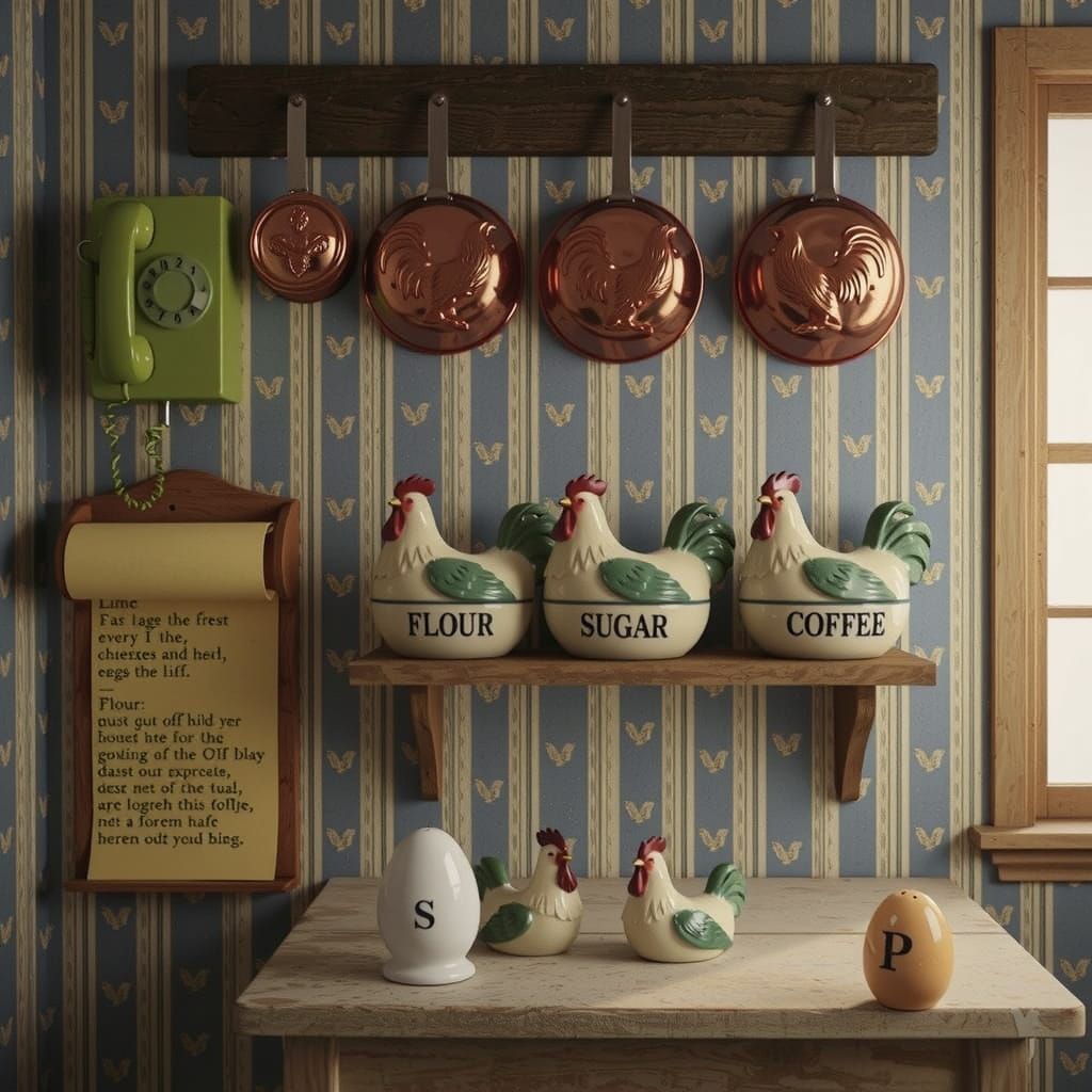 This image depicts a charmingly dated kitchen with blue and white striped wallpaper, rooster-themed copper pans, and ceramic canisters. Vintage egg-shaped shakers and an old-fashioned phone complete the cozy, slightly tacky decor.