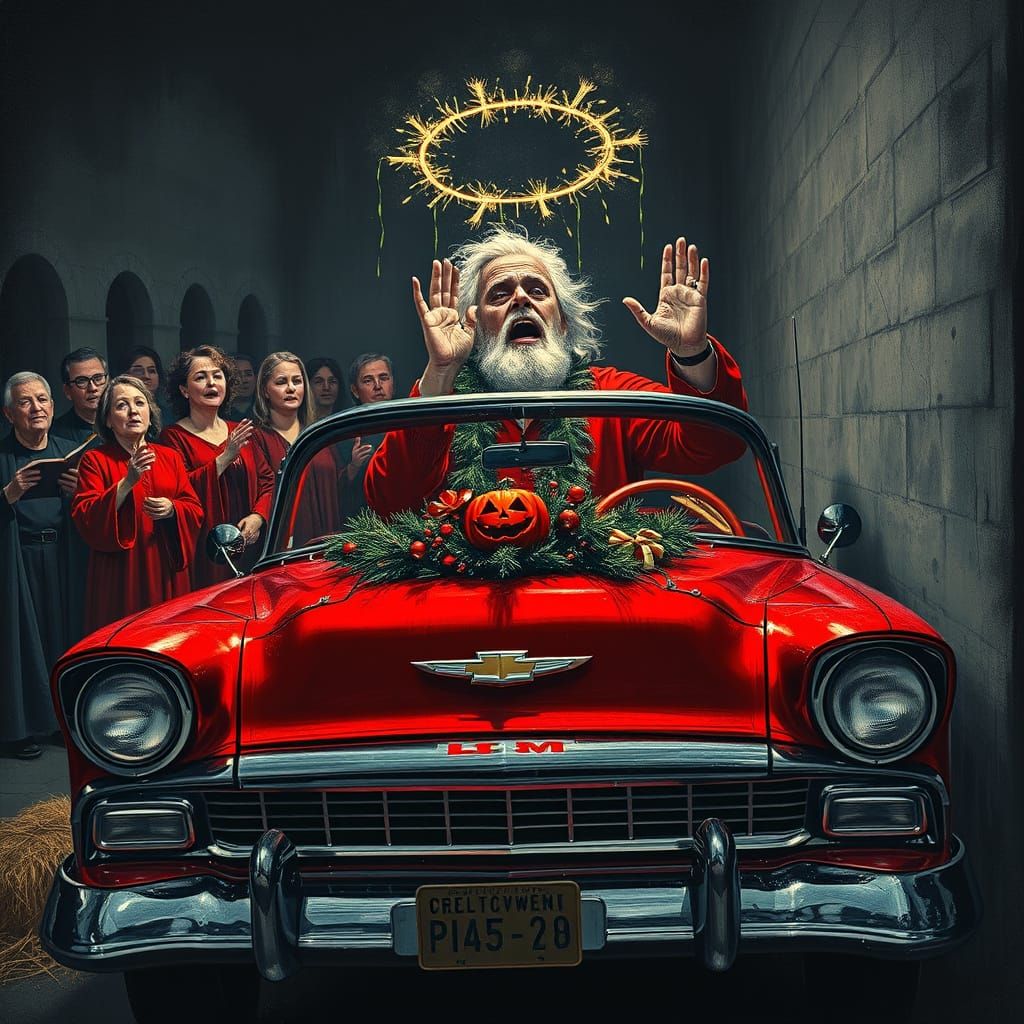 This image depicts a man with a Christmas light halo singing in a choir, taking an oath on a vintage Chevrolet. It features Halloween Fords, haystacks, and head-banging, rendered in a macabre, expressionistic style with deep reds, blacks, and whites.
