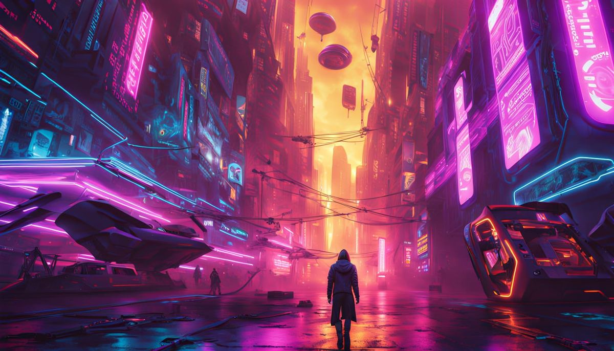 This image shows a time traveler jumping between ancient ruins and a futuristic city. The scene is rendered as hyper-realistic digital art with high contrast, volumetric glow, and hyperreal textures, in a cyberpunk aesthetic.