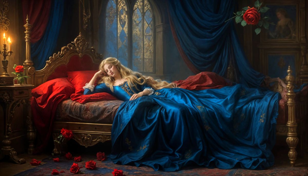 This image shows a beautiful Sleeping Beauty with long blond hair in a medieval gown, sleeping peacefully. The oil painting evokes a fairy tale mood with soft colors and gentle lighting in a gothic palace.