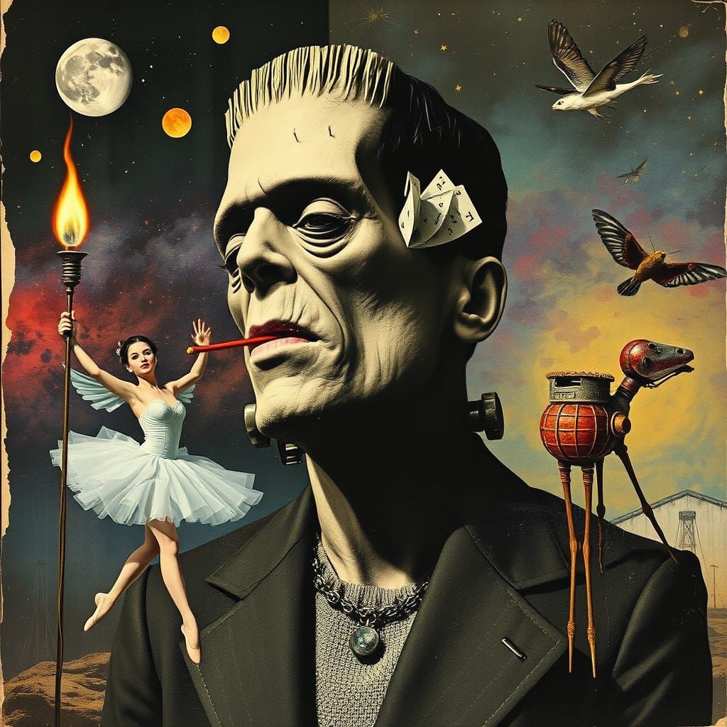 This image showcases whimsical Frankenstein-inspired cyberpunk creatures, rendered with a vibrant kaleidoscope aesthetic reminiscent of photomontage and abstract art.