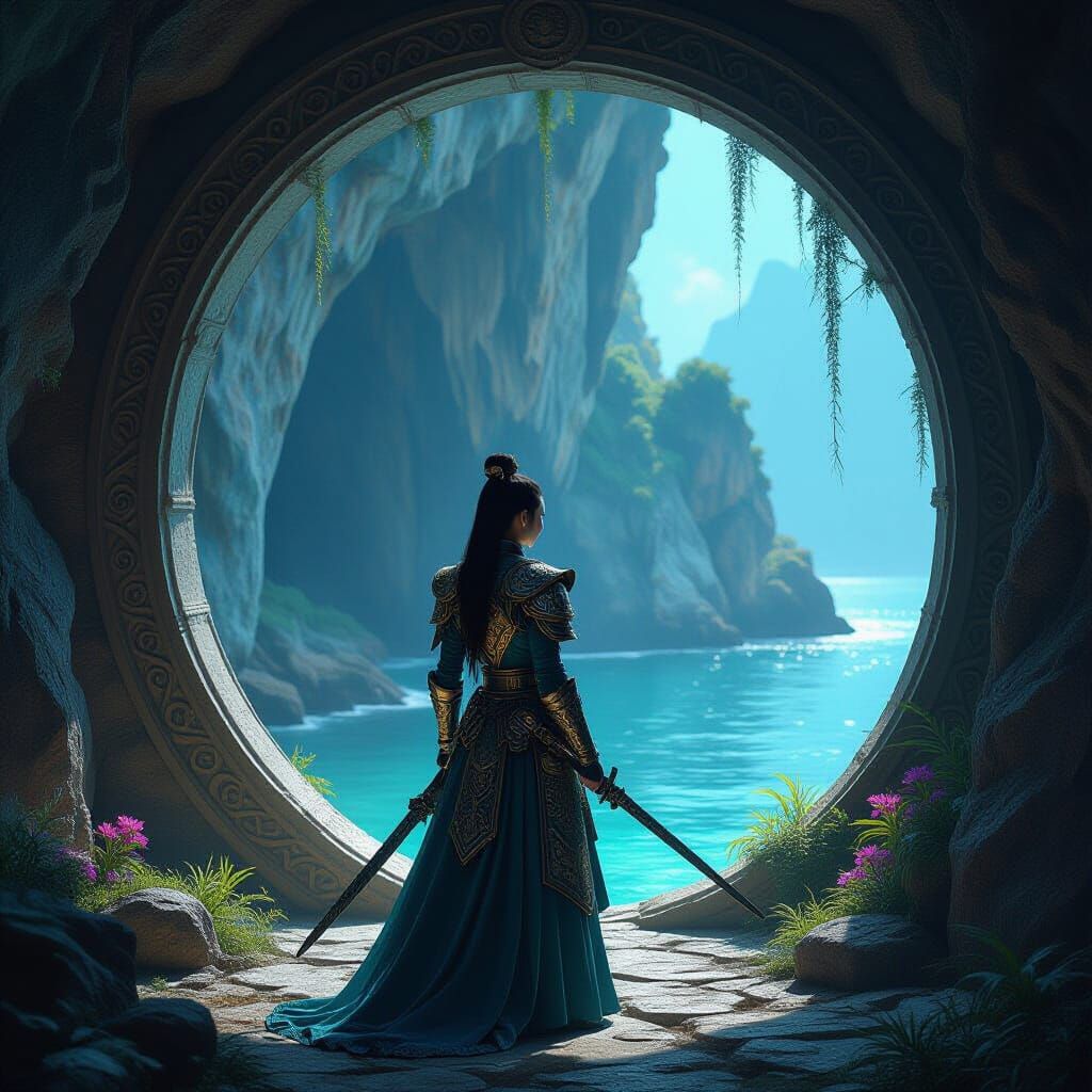 This image depicts a lone Korean warrior in detailed, ancient-dynasty-inspired armor guarding a mystical coastal grotto. Luminescent plants light the cave, showing Art Nouveau carvings, in a Renaissance painting style with dramatic lighting.