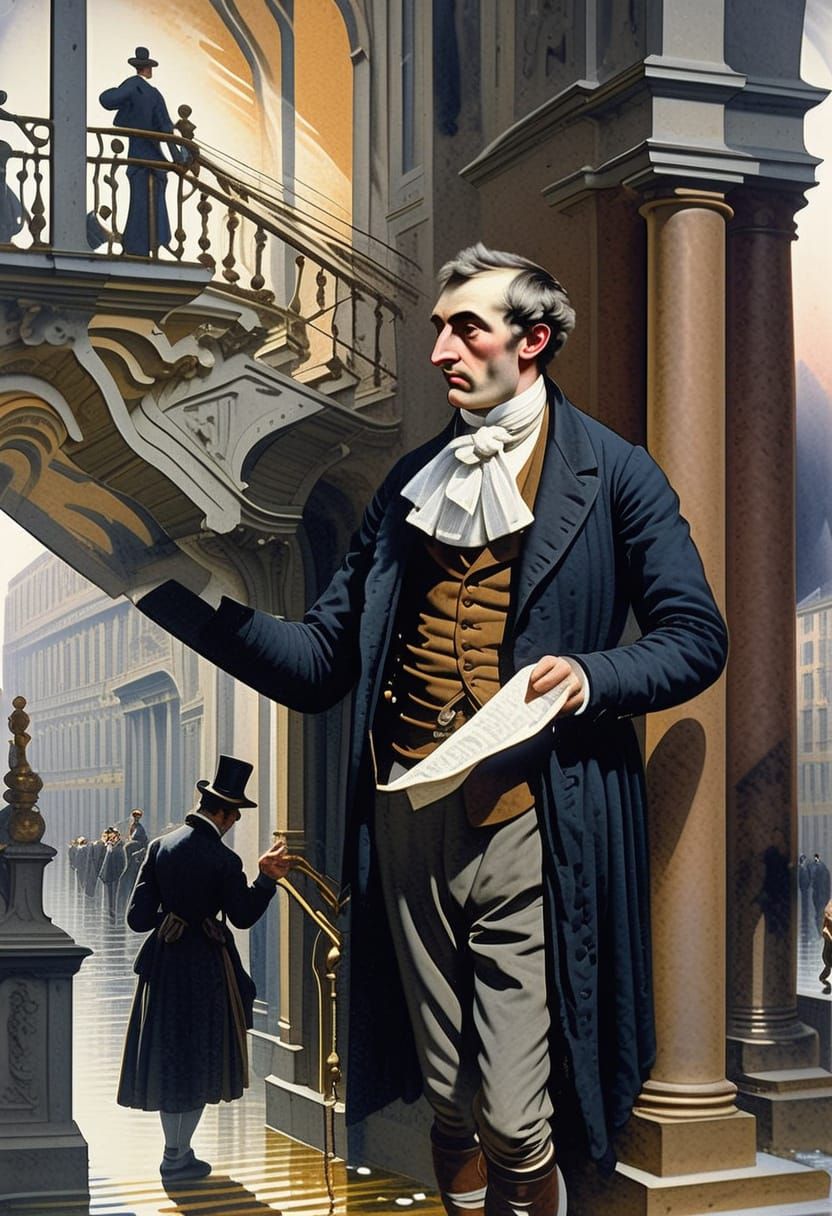 A striking picture of a man seeing his reflection in a puddle on a street during the golden hour. This watercolor-style image evokes a romantic and gothic aesthetic with dreamlike qualities.