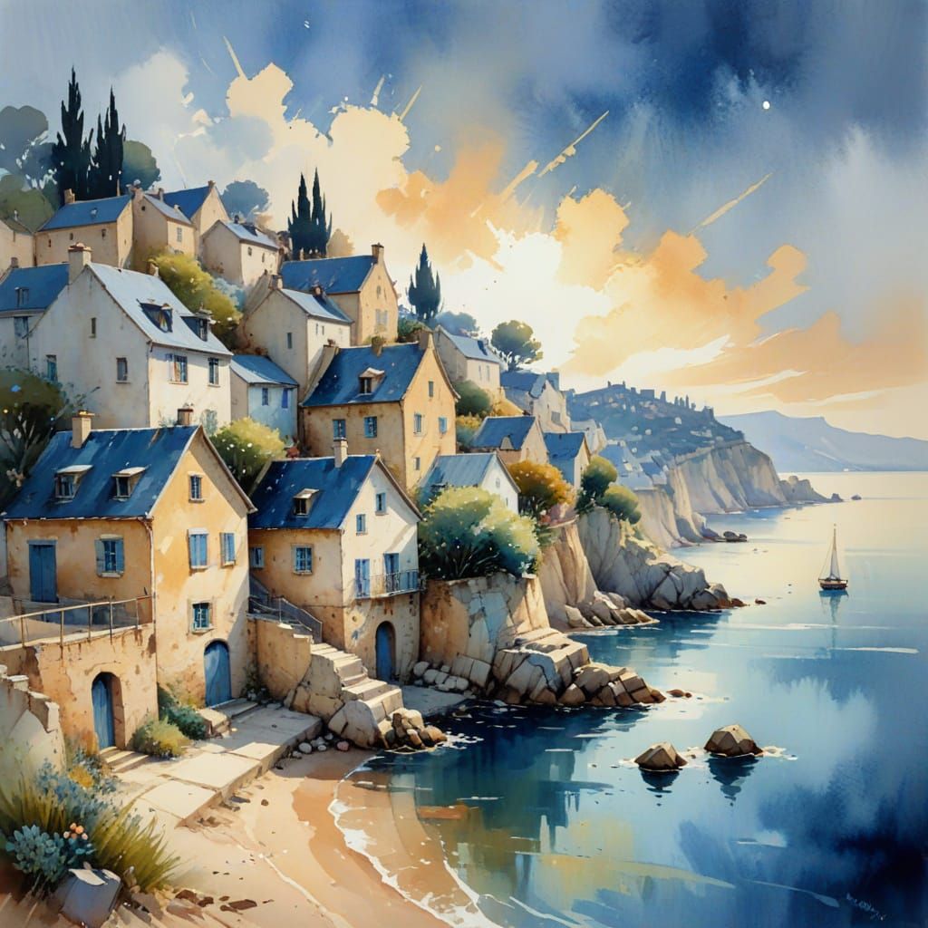 A serene French seaside village captured with soft brushstrokes and a warm golden light. This watercolor impressionist piece features fine details of rustic buildings with high contrast and gentle textures.