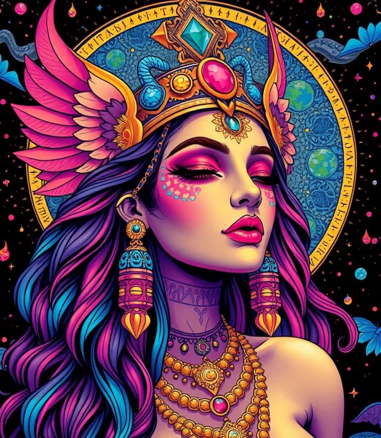 This image shows a vibrant, psychedelic interpretation of the goddess Isis. The artwork features a multi-colored palette, creating a visually striking and otherworldly aesthetic.