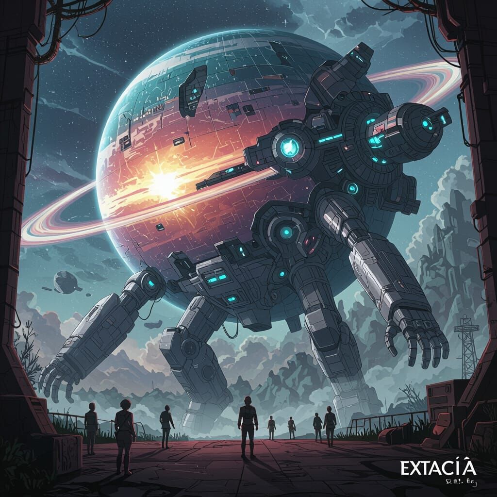 A colossal bio-mechanical exoplanet, Extacía, used for testing biological weapons. Presented in a dynamic anime style with high-contrast lighting and intricate mechanical details.