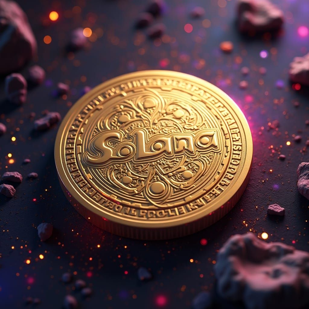 This image features a detailed 14k gold Solana coin with vibrant colors, presented in a futuristic 3D anime art style reminiscent of concept art.