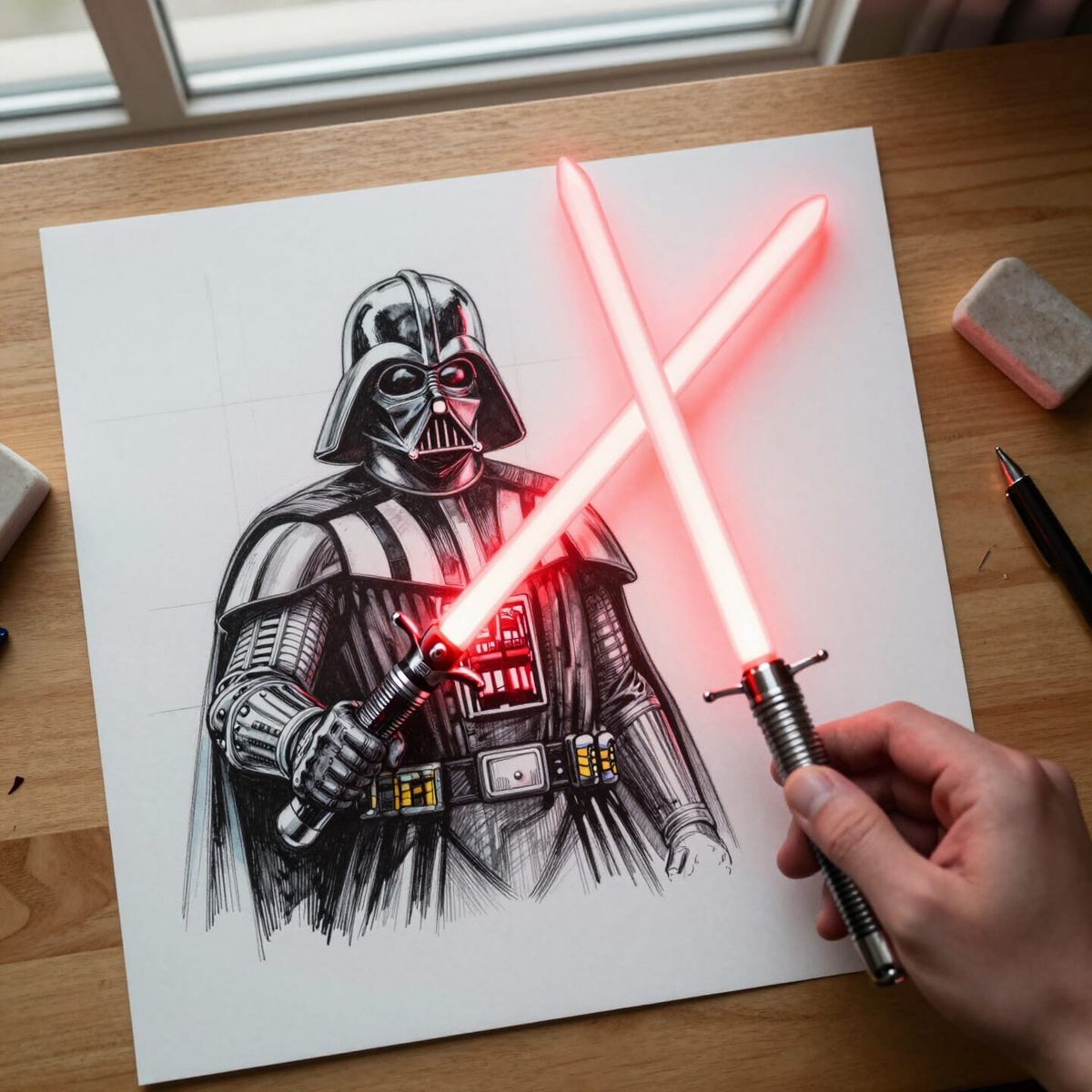 This image features a hand-drawn Darth Vader ink sketch. A hyper-realistic 3D lightsaber blade emerges from the drawing, casting a red glow on the art supplies and desk in a mixed-media style.