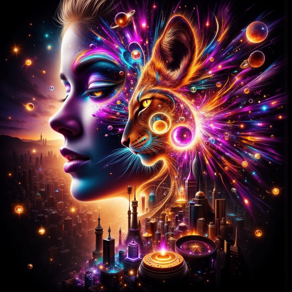This image depicts Vegas showgirls adorned with feathers and sparkles, celebrating a gay wedding. It features silhouetted wedding rings and bells, with elements of tigers and casino games in a vibrant, colorful double exposure.