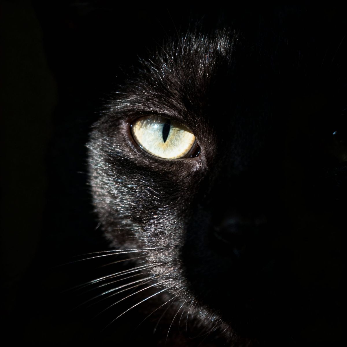 This image shows a dramatic close-up of a black cat's face, half-lit by a single spotlight. Features cinematic lighting and ultra-realistic detail.