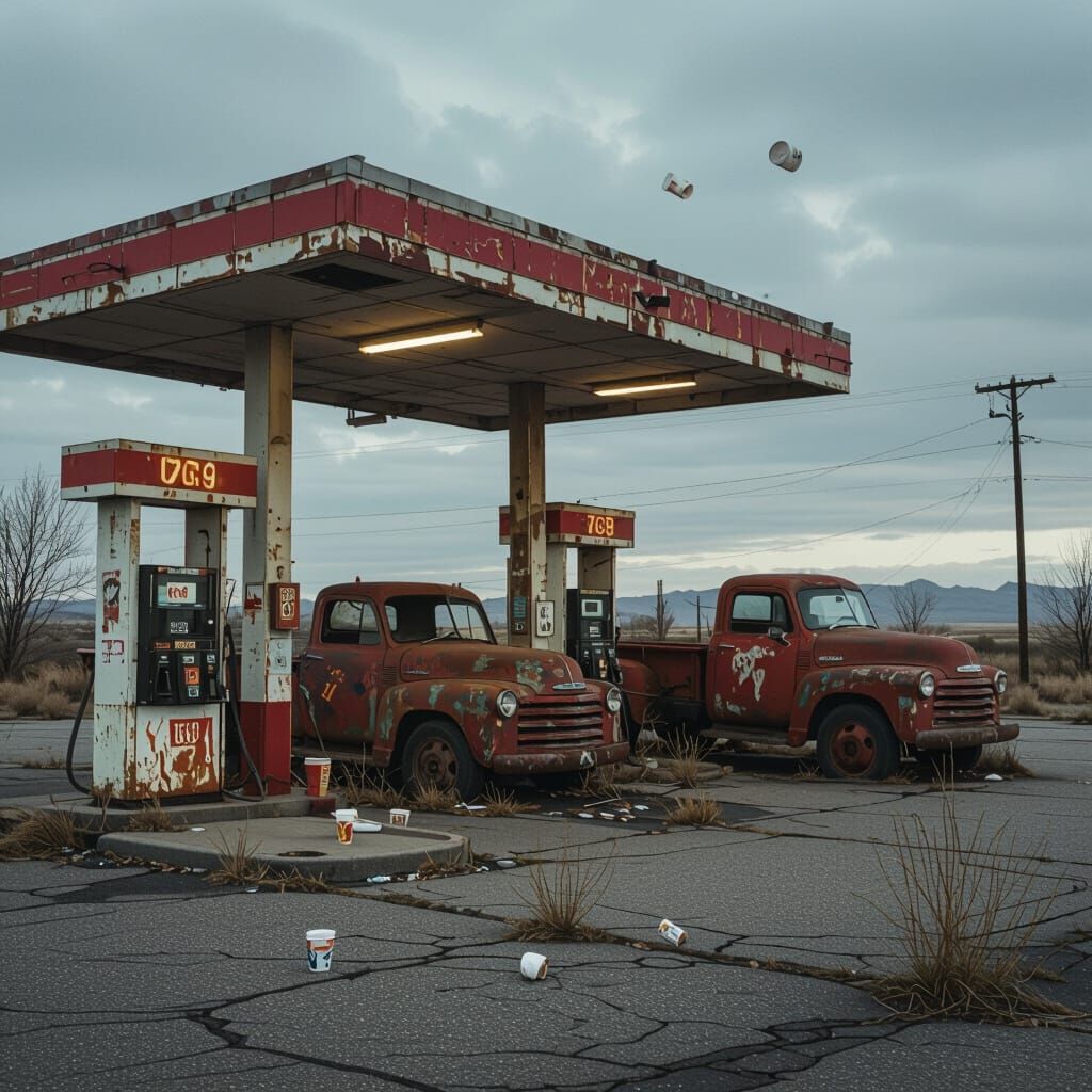 This image shows an abandoned gas station two days after humanity's disappearance. Trucks are parked haphazardly, fuel pumps are decaying, and the scene is rendered with photorealistic atmospheric decay in a post-apocalyptic style.