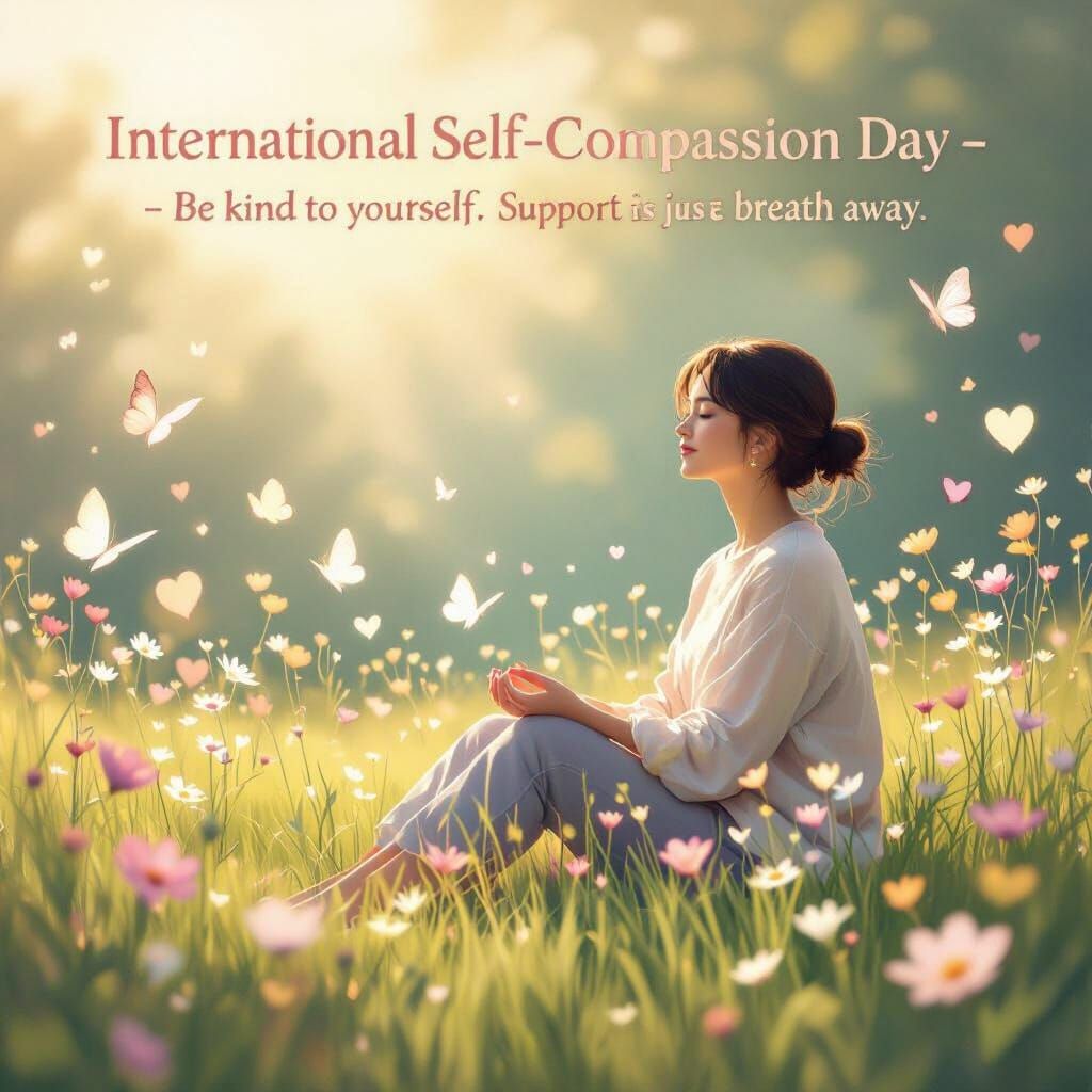This image shows a person in a peaceful, sunlit meadow, surrounded by butterflies and heart shapes. A modern digital illustration with a pastel color palette and elegant text overlays.