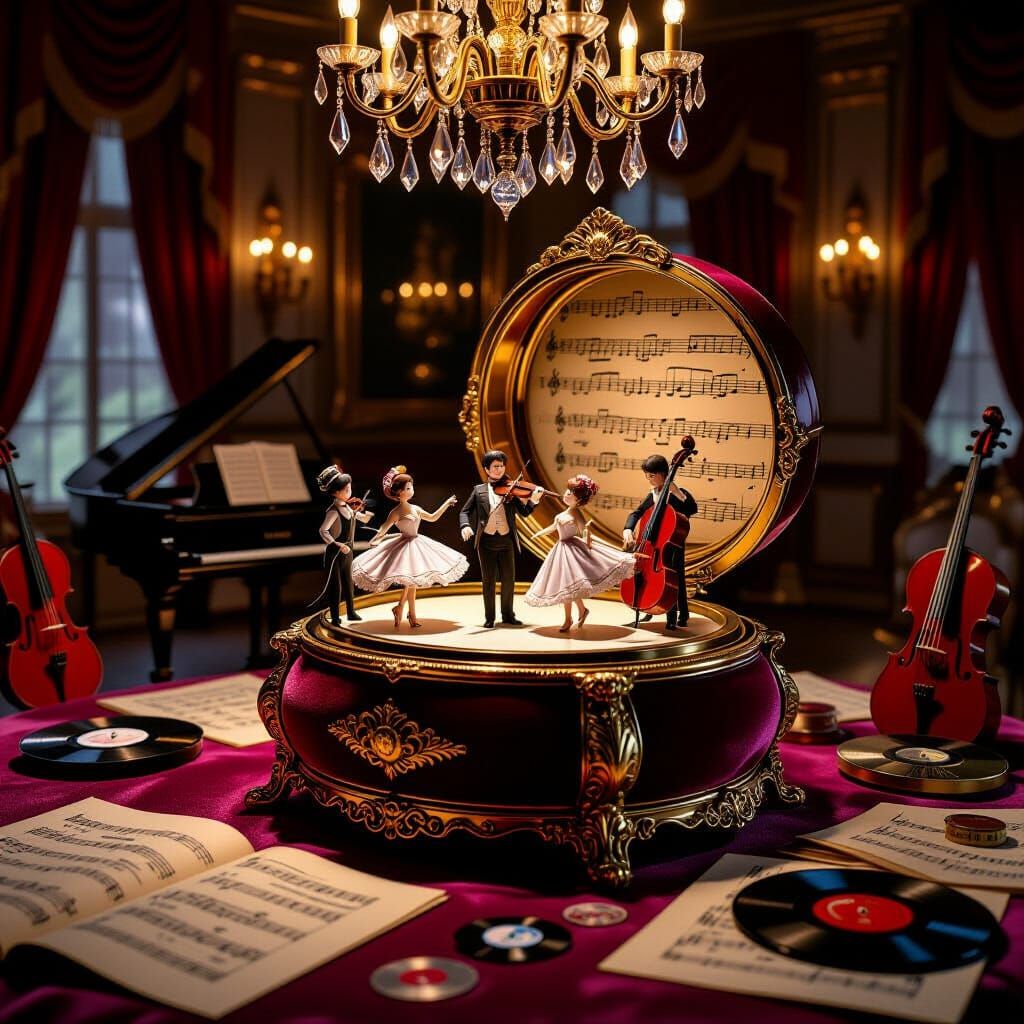 This image shows a grand ballroom contained within a music box, complete with miniature dancers and musicians. The scene is rich with intricate details, soft lighting and warm colors, rendered in a hyperrealistic style.