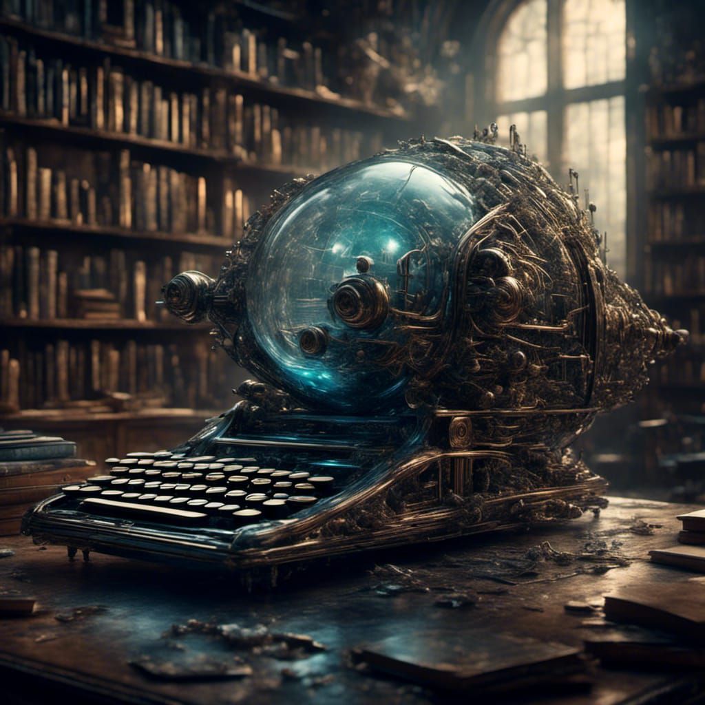 A surreal digital artwork blending a vintage typewriter and a futuristic spaceship in a library. The image features metallic grays, aged brass, and cool blues, rendered with high detail.