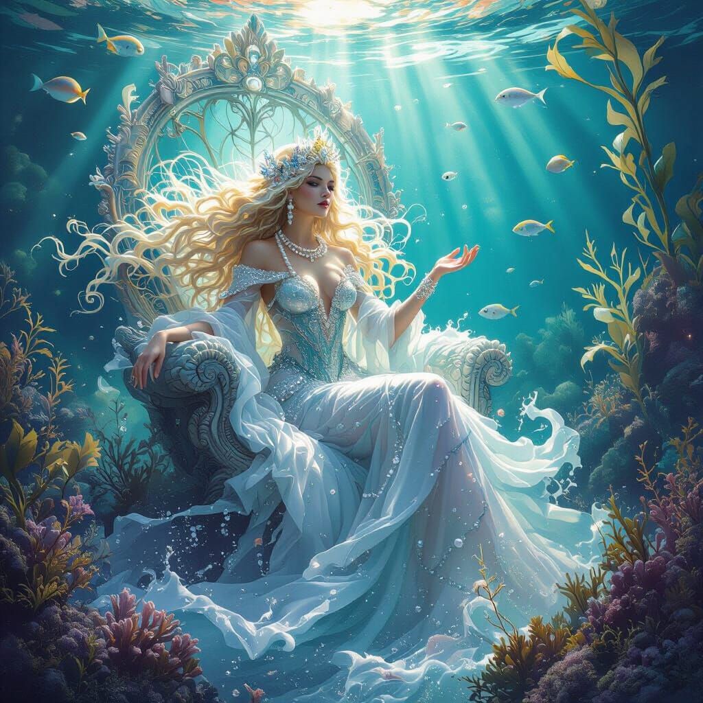 This surrealist digital painting depicts a radiant ocean goddess on a coral throne, commanding swirling waters. Flowing lines and organic forms create a mystical, deep-sea atmosphere with bioluminescent light.