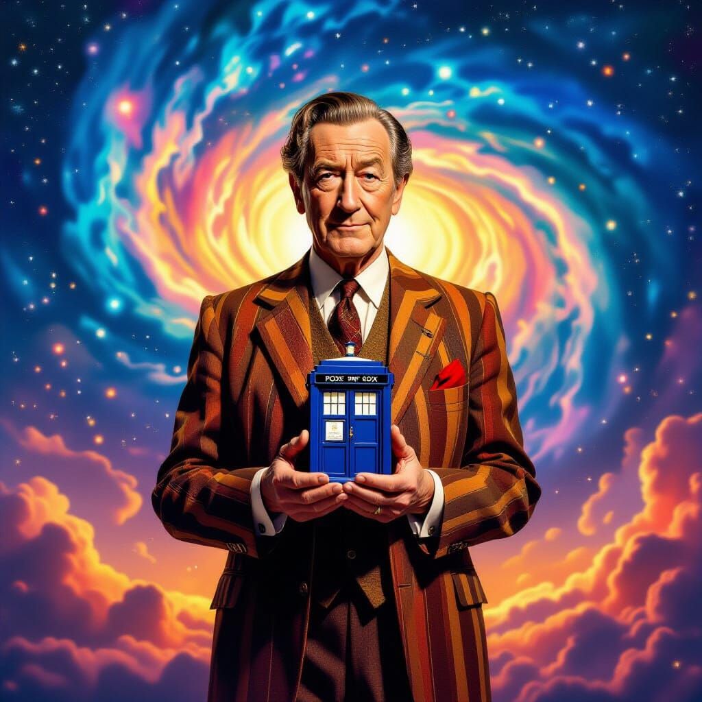 William Harrell as a wise, elderly time traveler. He stands confidently against a vibrant, swirling galaxy. In his hands, he cradles a small Tardis, symbolizing his adventures through time and space.
