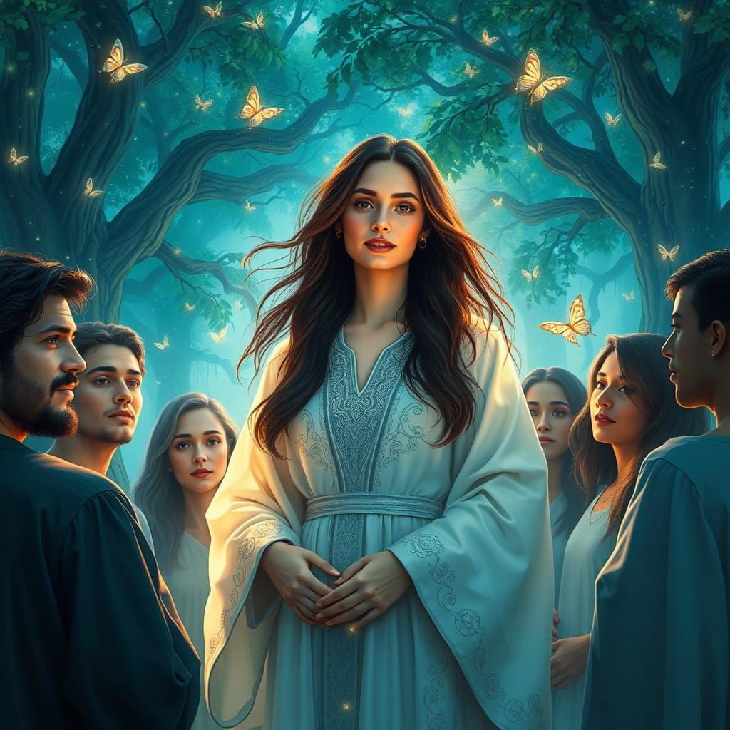 This image shows a serene and mystical scene of a brunette woman surrounded by friends of all ages, in a lush, vibrant environment filled with life and color. The group gathers around her, offering support and comfort as she heals her mind and spirit.