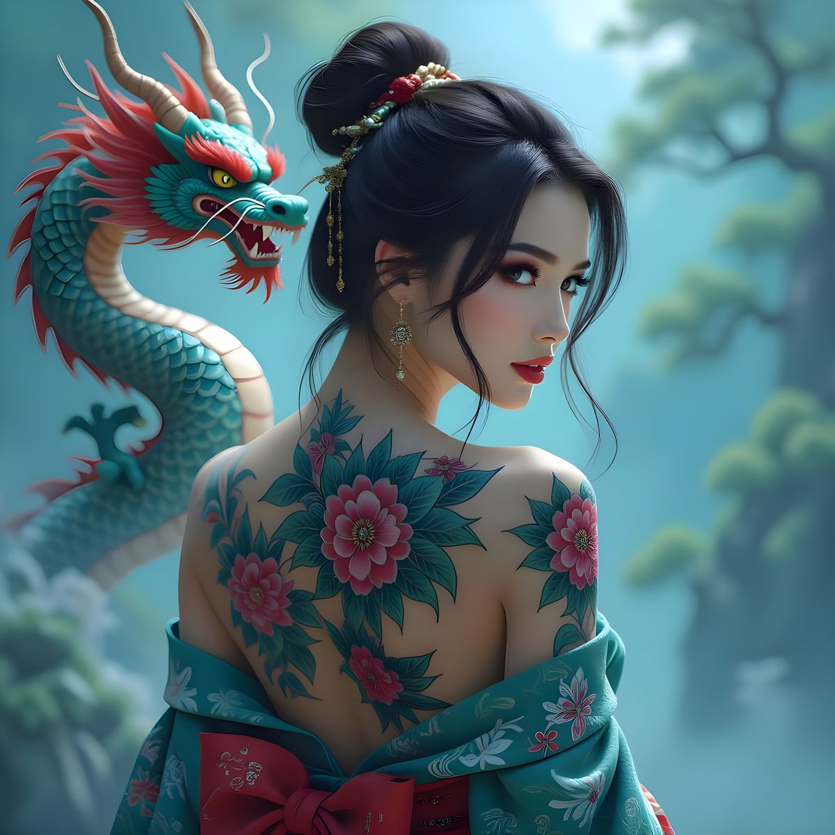 This detailed digital illustration shows a woman with a Japanese dragon tattoo on her back as the dragon animates. Features sharp focus and maximalist design in cool colors.