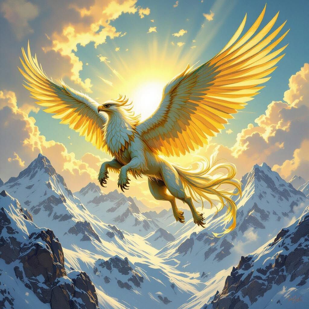 A majestic griffin soars above snow-capped mountains in a sunlit sky. The creature's feathers shimmer in gold and emerald, rendered with rich colors and dramatic lighting reminiscent of classic fantasy art.