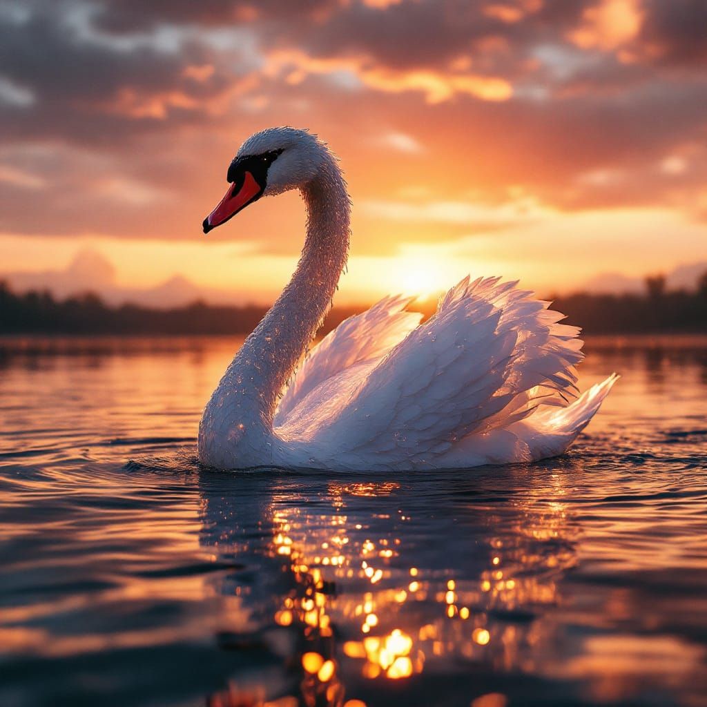 This image shows a swan sculpted entirely from water, gliding on a lake under a vibrant sunset. Cinematic lighting and film grain enhance its ethereal beauty.