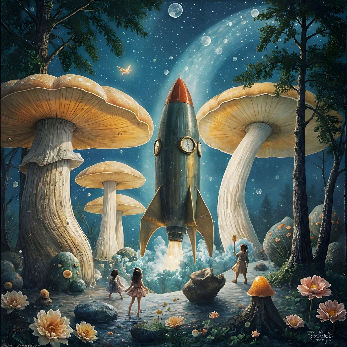 A vibrant 3D image showing a vintage rocket amidst giant mushrooms in an enchanted forest. Fairies flit among water droplets, with crystalline formations adorning the rocket in a gouache style.