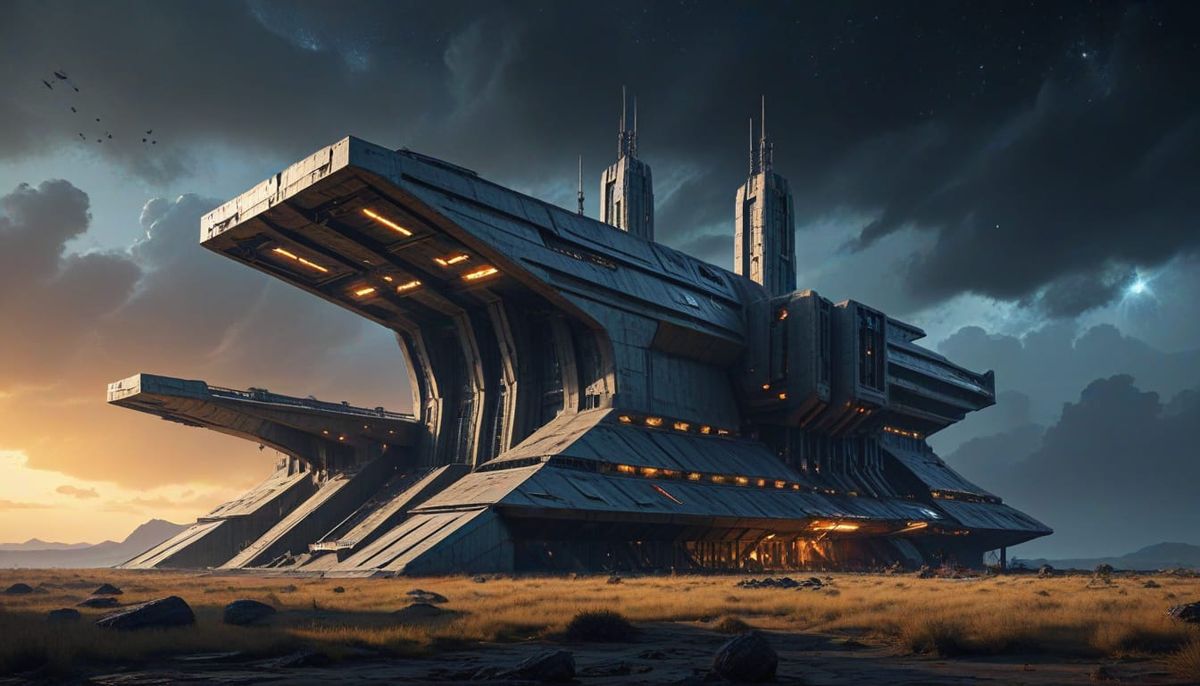 This image depicts a cosmic-themed hangar in a brutalist monolithic architectural style. The structure evokes a sense of vastness and industrial strength within a celestial setting.