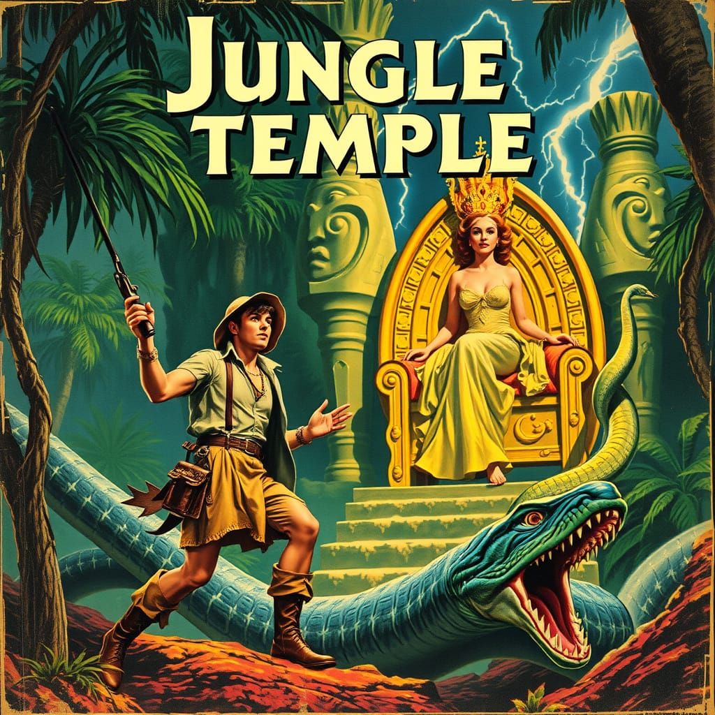 A vintage pulp-style illustration of an explorer fighting giant snakes in a jungle temple, observed by a serpent queen. The dramatic scene is set against a stormy sky.