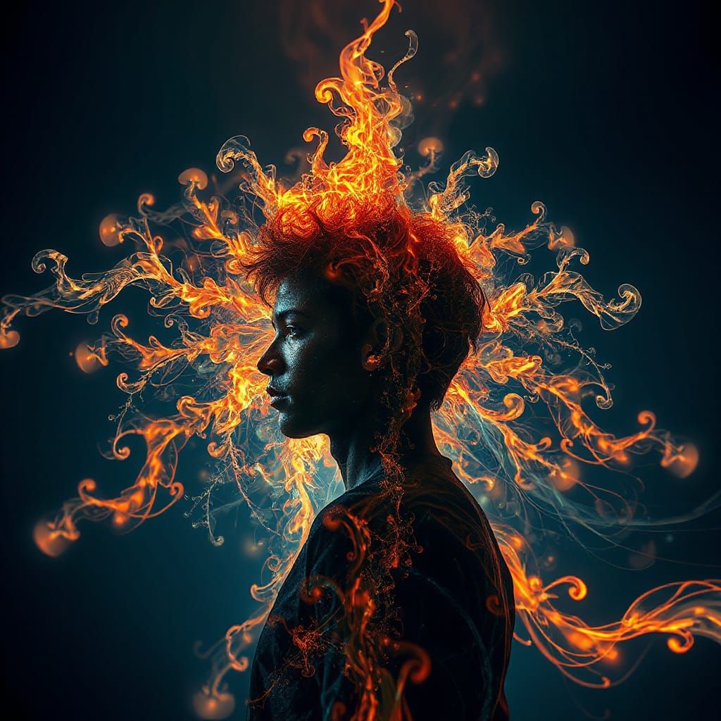This surreal image features a silhouette filled with vibrant, fractal streams and organic tendrils of color. It evokes a dreamlike atmosphere with painterly realism and experimental color diffusion.