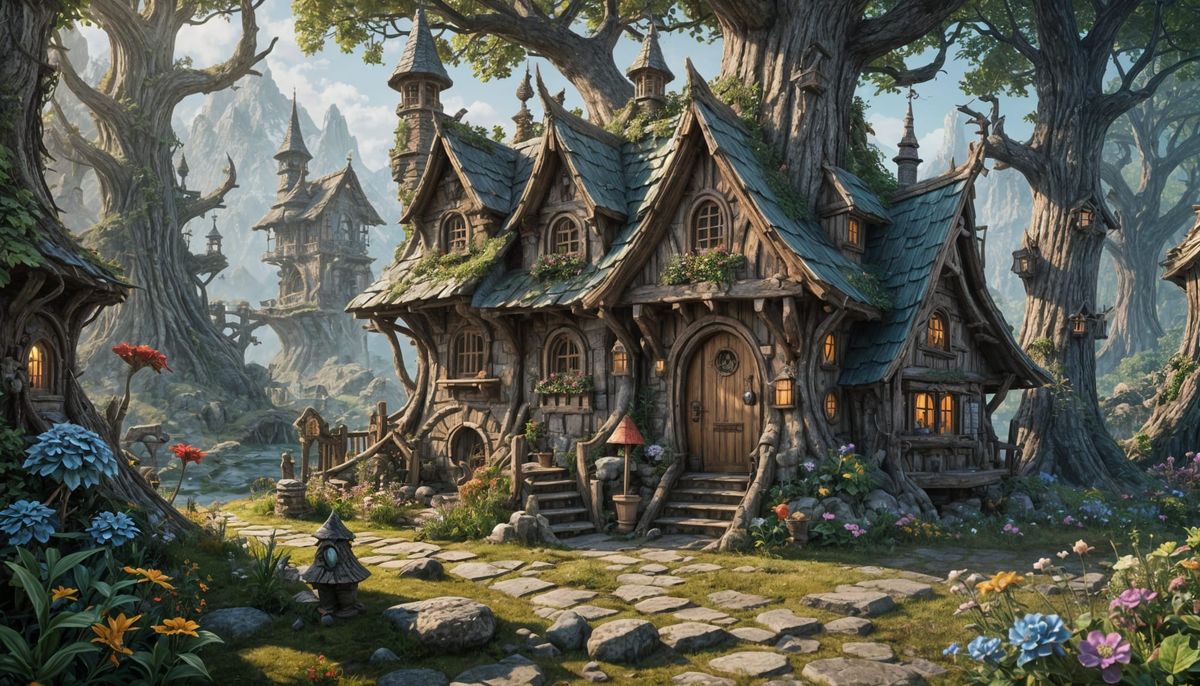 This image shows a detailed matte painting of a gnome house. The fantastical concept art features intricate details, deep colors and complementary color schemes in 8k resolution trending on Artstation.