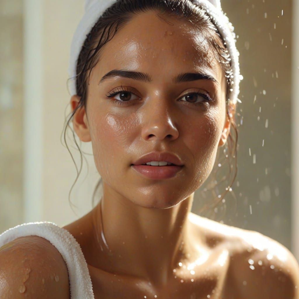 A medium shot of a mixed race woman in a shower, wearing a towel. Soft water droplets cover her face, with warm light illuminating her hair. The image is an impressionist painting with pastel colors.