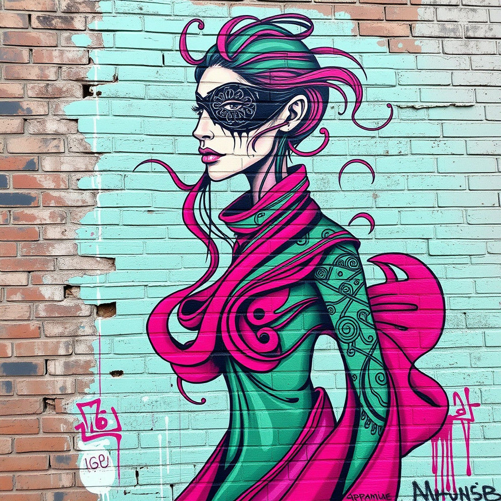 A striking picture of a graffiti mural featuring a surreal female figure. The artwork blends organic and geometric elements in bold colors, reminiscent of futuristic biomechanics and dreamlike visions.